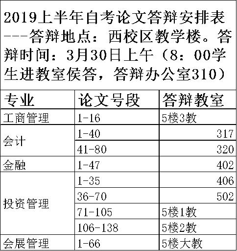 一.答辩时间:2019年3月30日上午8:00(考生按下面附表中论文编号所对应教室等候答辩)(特别说明:请考生在答辩前一周登陆本网址再次确认答辩通知,以防因特殊情况发生调整).