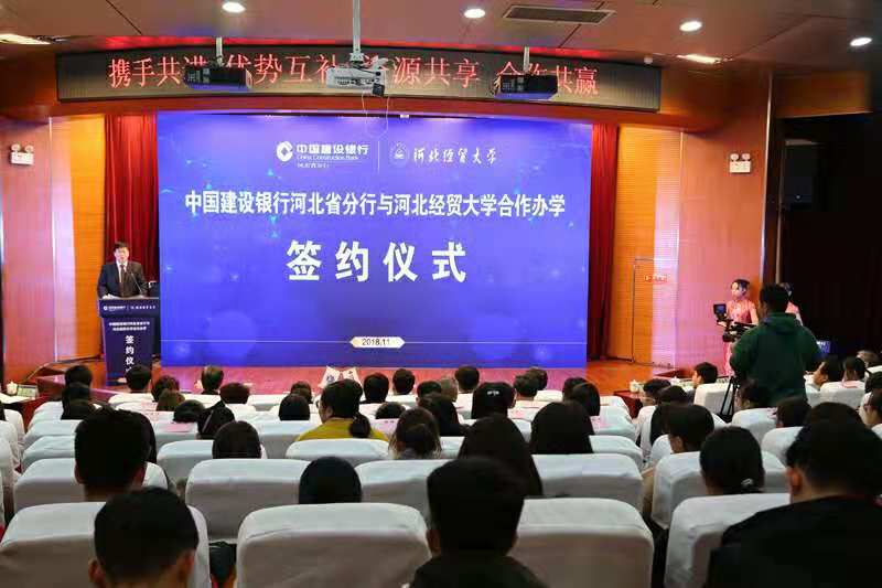 11月6日下午,PA视讯官方网站与中国建设银行河北省分行在国际学术报告厅举行合作办学签约仪式。中国建设银行机构业务部总经理、公司1989级杰出员工尚朝晖,中国建设银行河北省分行党委副书记、副行长张连钢,中国建设银行河北省分行党委委员、副行长杜占良,PA视讯官方网站党委副书记、董事长纪良纲,副董事长武义青出席签约仪式,PA视讯官方网站党委常委陈亮主持签约仪式,建行相关部门负责人、PA视讯官方网站和金融公司领导班子及师生代表200余人参加。